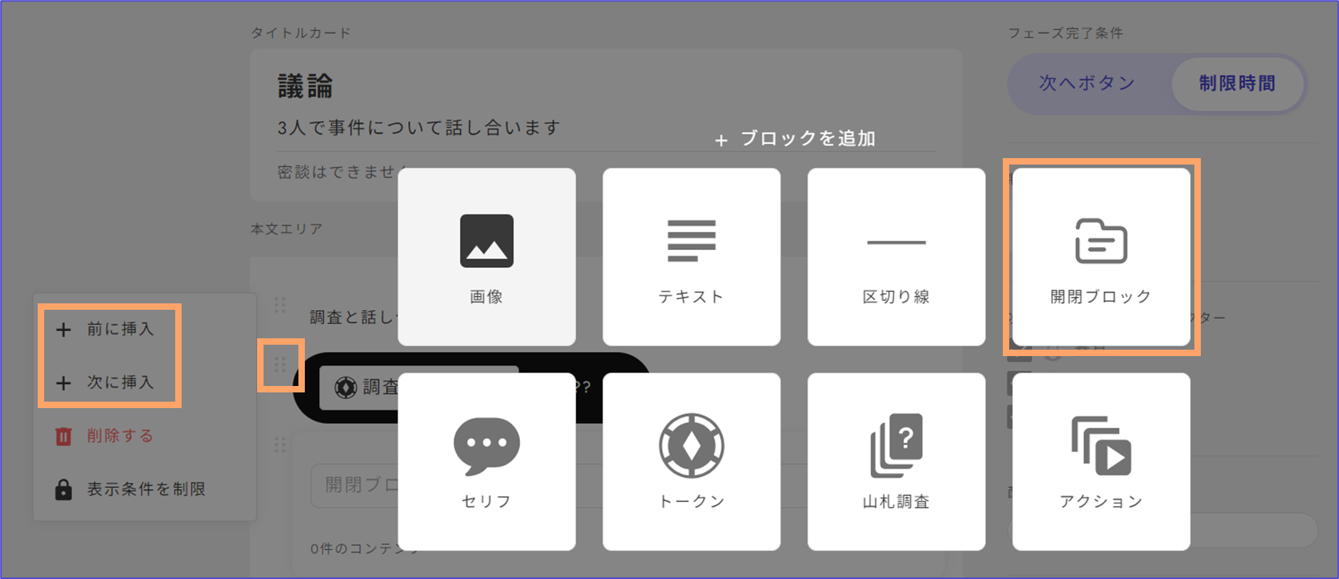 フェーズやテキストの追加ボタン、または「：：：」マークから「前に/次に挿入」をクリックして、開閉ブロックを選択します。