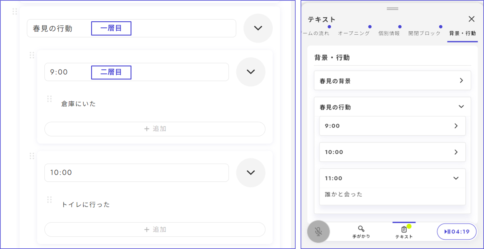 以下の画像は山札を追加した場合を示しています。複数の調査箇所をまとめたいとき、ジャンル分けしたいときなどに便利です。実際のプレイ画面では矢印部分をタップすると右のようにブロックが開きます。