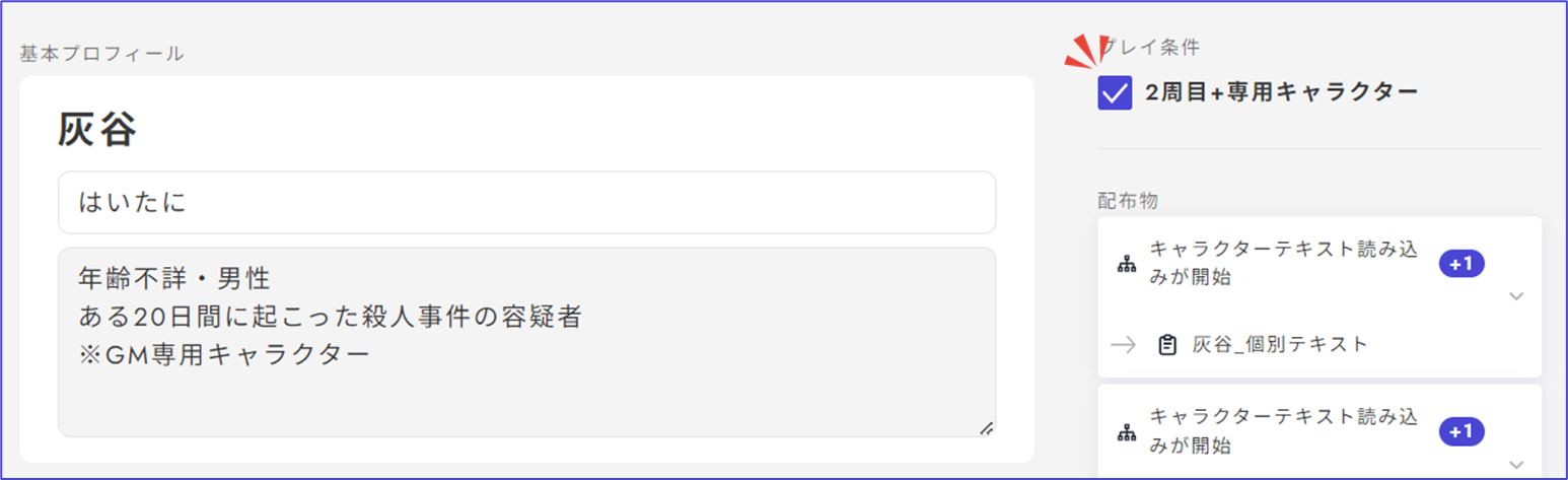 * 「2周目＋専用キャラクター」にチェックを入れたキャラクターは、そのキャラクター以外でそのシナリオをプレイ済みの人、シナリオ詳細画面の未プレイボタンをプレイ済みに変えた人だけが選択できます。