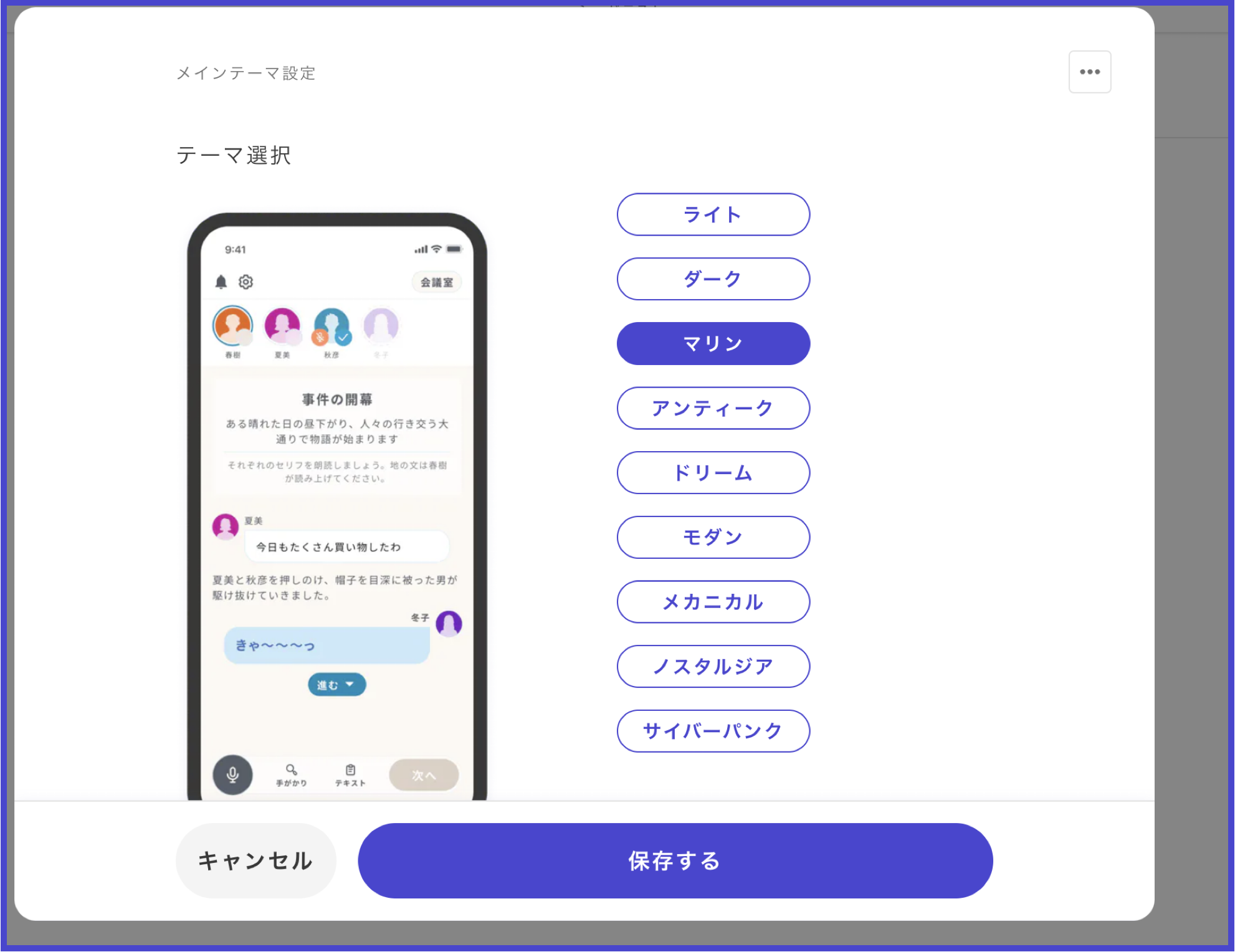 <table data-view="cards"><thead><tr><th></th><th></th><th></th></tr></thead><tbody><tr><td><strong>ライト</strong></td><td><img src="https://1279302283-files.gitbook.io/~/files/v0/b/gitbook-x-prod.appspot.com/o/spaces%2FgOyErfAjeKrNXFgLBxtx%2Fuploads%2Fgit-blob-025b20ca51011cae13aeb96426d8989c92bab2fb%2Flight.png?alt=media" alt="" data-size="original"></td><td></td></tr><tr><td><strong>ダーク</strong></td><td><img src="https://1279302283-files.gitbook.io/~/files/v0/b/gitbook-x-prod.appspot.com/o/spaces%2FgOyErfAjeKrNXFgLBxtx%2Fuploads%2Fgit-blob-68f5e3d3e4de72614f922fa176b090d8469c7d74%2Fdark.png?alt=media" alt="" data-size="original"></td><td></td></tr><tr><td><strong>マリン</strong></td><td><img src="https://1279302283-files.gitbook.io/~/files/v0/b/gitbook-x-prod.appspot.com/o/spaces%2FgOyErfAjeKrNXFgLBxtx%2Fuploads%2Fgit-blob-300db8caec56bf4a436087aac51dd0dda29e7825%2Fmarine.png?alt=media" alt="" data-size="original"></td><td></td></tr><tr><td><strong>アンティーク</strong></td><td><img src="https://1279302283-files.gitbook.io/~/files/v0/b/gitbook-x-prod.appspot.com/o/spaces%2FgOyErfAjeKrNXFgLBxtx%2Fuploads%2Fgit-blob-c48cb76454c4ba9552d87c6e5762e6b0720eb42e%2Fantique.png?alt=media" alt="" data-size="original"></td><td></td></tr><tr><td><strong>ドリーム</strong></td><td><img src="https://1279302283-files.gitbook.io/~/files/v0/b/gitbook-x-prod.appspot.com/o/spaces%2FgOyErfAjeKrNXFgLBxtx%2Fuploads%2Fgit-blob-f144880a984703db95f3219bb78f11ec891e13ca%2Fdream.png?alt=media" alt="" data-size="original"></td><td></td></tr><tr><td><strong>モダン</strong></td><td><img src="https://1279302283-files.gitbook.io/~/files/v0/b/gitbook-x-prod.appspot.com/o/spaces%2FgOyErfAjeKrNXFgLBxtx%2Fuploads%2Fgit-blob-d60b6293058e6df6fb90b9405a0acb4abb2d6c6f%2Fmodern.png?alt=media" alt="" data-size="original"></td><td></td></tr><tr><td><strong>メカニカル</strong></td><td><img src="https://1279302283-files.gitbook.io/~/files/v0/b/gitbook-x-prod.appspot.com/o/spaces%2FgOyErfAjeKrNXFgLBxtx%2Fuploads%2Fgit-blob-067cdd1c5c591648044860ec4c56c2b1cfd211be%2Fmechanical.png?alt=media" alt="" data-size="original"></td><td></td></tr><tr><td><strong>ノスタルジア</strong></td><td><img src="https://1279302283-files.gitbook.io/~/files/v0/b/gitbook-x-prod.appspot.com/o/spaces%2FgOyErfAjeKrNXFgLBxtx%2Fuploads%2Fgit-blob-4c931f19c13cffa1a3f82088f41b43dd69d2a0fa%2Fnostalgia.png?alt=media" alt="" data-size="original"></td><td></td></tr><tr><td><strong>サイバーパンク</strong></td><td><img src="https://1279302283-files.gitbook.io/~/files/v0/b/gitbook-x-prod.appspot.com/o/spaces%2FgOyErfAjeKrNXFgLBxtx%2Fuploads%2Fgit-blob-77b1988c90ffb88c6304c9599f9021a2407cdcd9%2Fcyberpunk.png?alt=media" alt="" data-size="original"></td><td></td></tr></tbody></table>