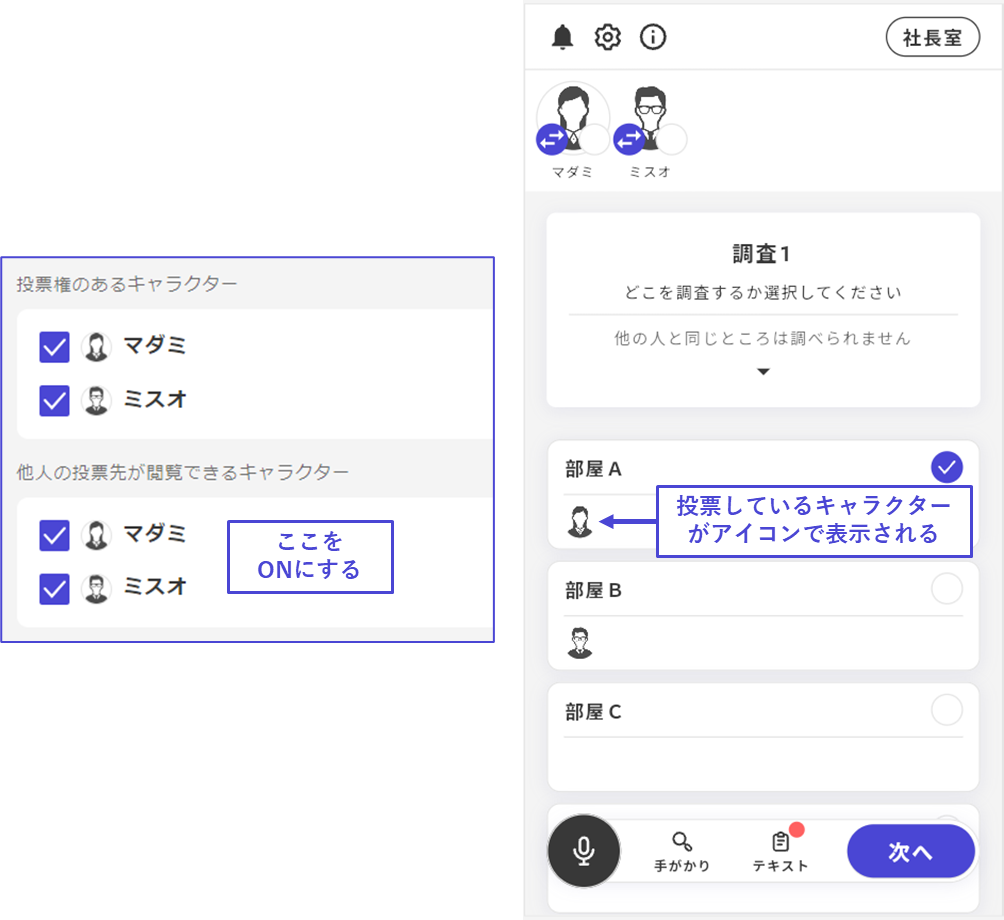 該当の投票フェーズの投票内容を閲覧できるキャラクターを設定します。この設定をONにしたキャラクターの画面では、誰がどこに投票したのかがアイコンで示されます。重複投票を回避したい場合に有効です。