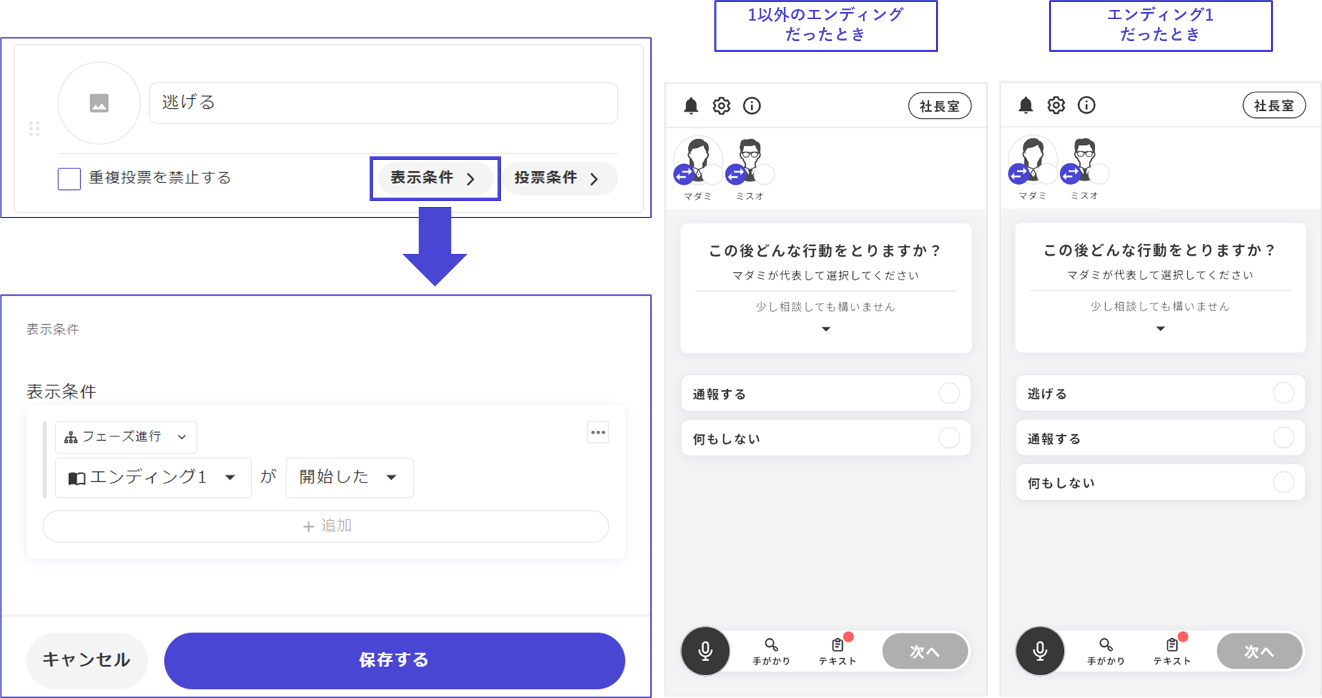 「表示条件」は、ある特定の条件を満たしたときのみ、その選択肢が現れるようにする設定です。条件を満たしていないときは全キャラクターの画面で完全に非表示になるのが特徴です。 あるフェーズに辿り着いている時、ある手がかりを持っている時といった条件と相性が良いでしょう。