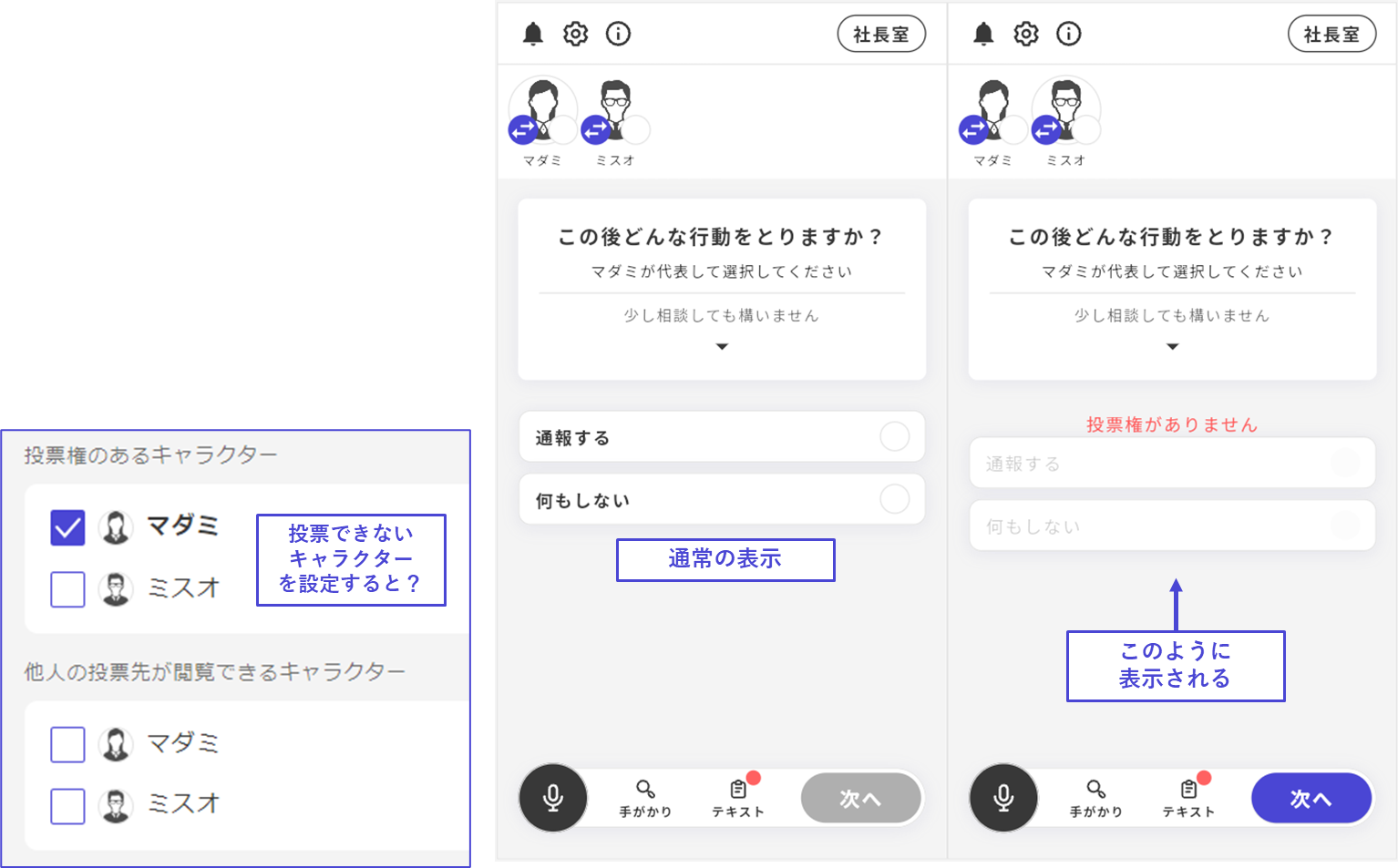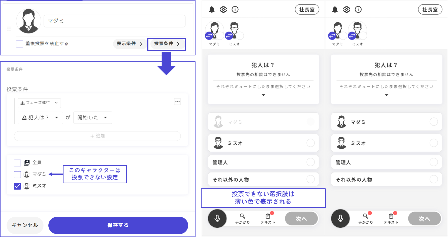 該当の投票フェーズで投票できるキャラクターを設定します。ここで特定のキャラクターを設定すると、そのキャラクターしか投票を行うことができません。代表者一人に投票を行わせたい場合などに有効です。