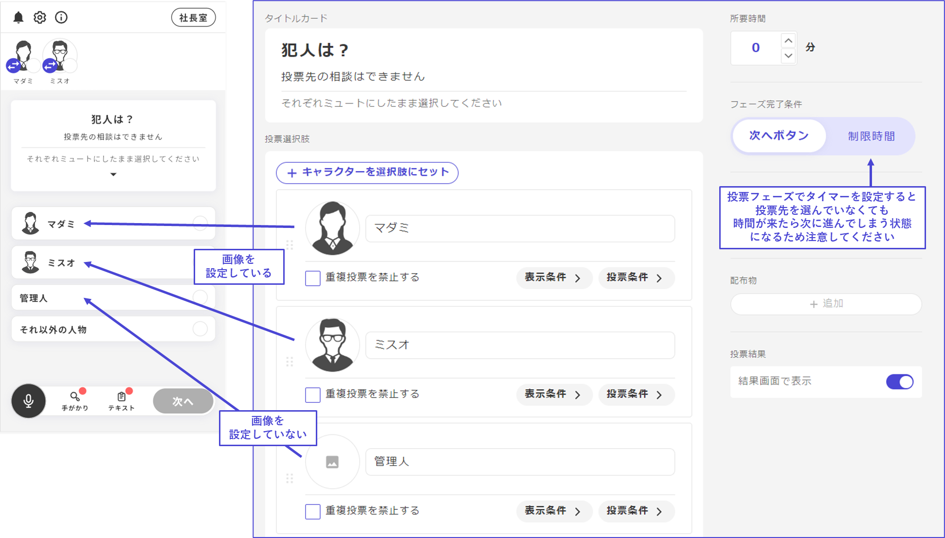 制限時間：投票先を選択していなくても、設定したタイマーが0秒になったら次へ進んでしまいます。投票のあるフェーズで制限時間を設定する場合は注意してください。