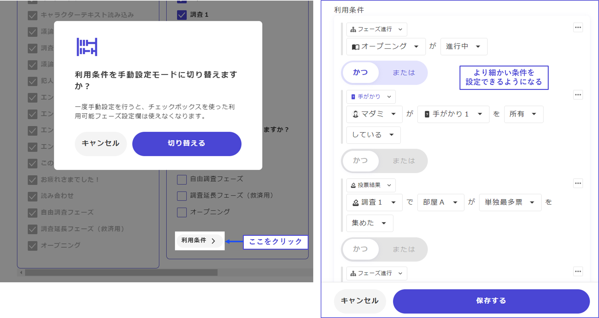 密談ができるフェーズを設定するだけでいい場合は、チェックボックスからフェーズを選択します。