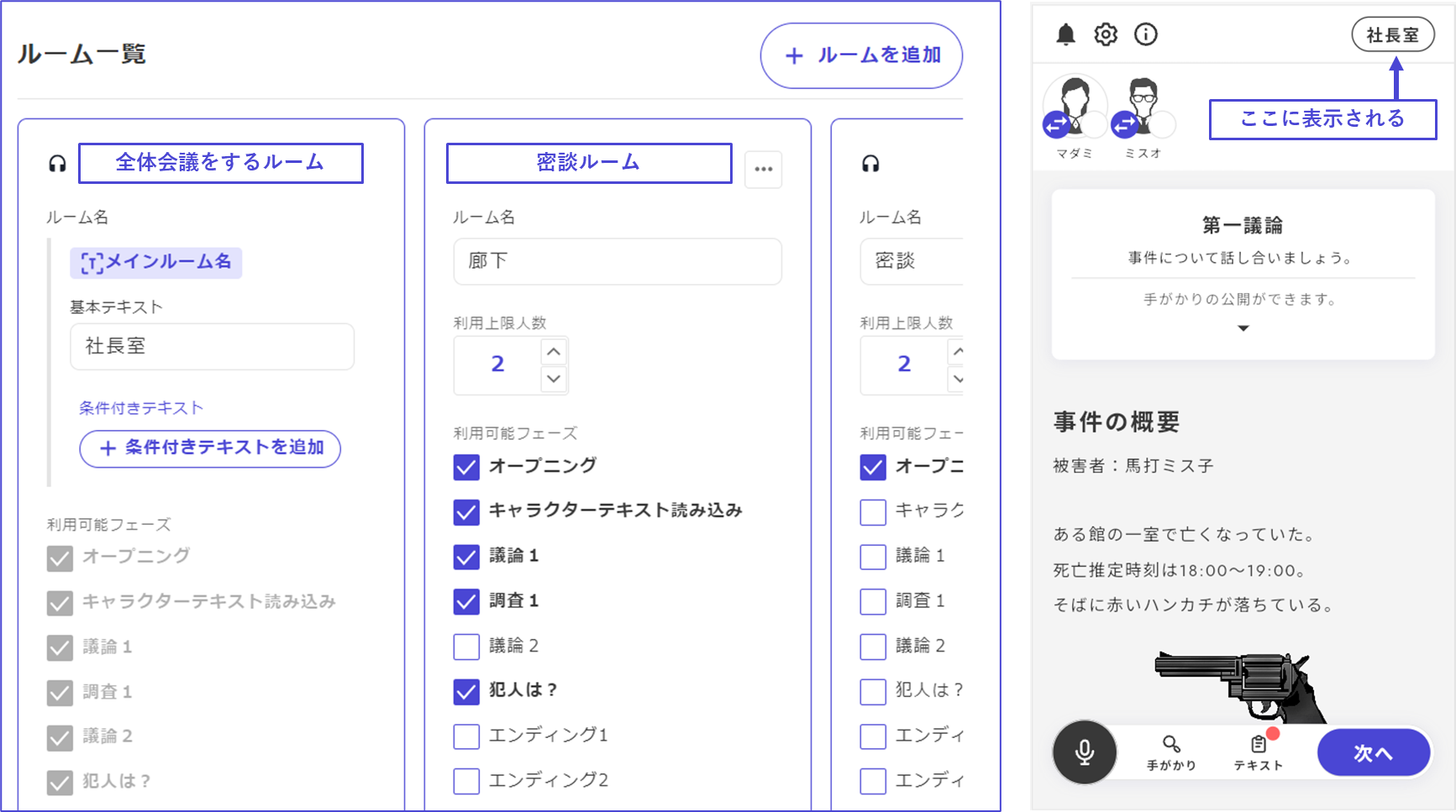 １つは必ず**全てのフェーズで全員が使用できるルーム**である必要があるので、削除できないようになっています（画像内 一番左のもの）。