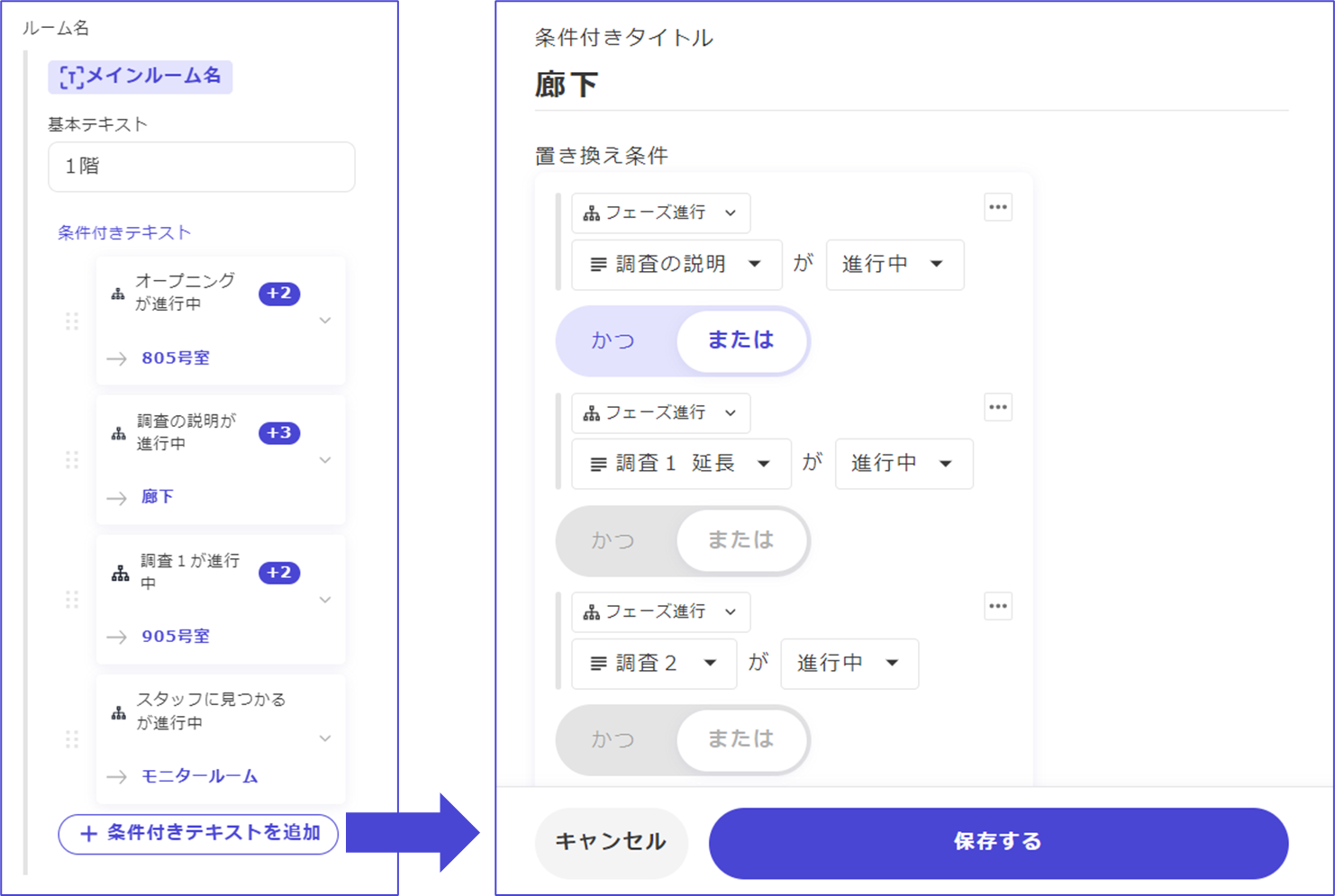 例えば、フェーズ１では「１階」にいて、フェーズ２では「２階」、フェーズ３では「廊下」にいる、のようにフェーズが進むごとに場所が移動していると演出したいときに便利です。