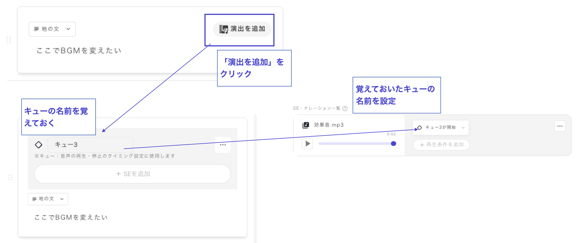 SE (Sound Effects) and narration are used for playing sounds that are played only once, such as sound effects or narration during the read-along phase.