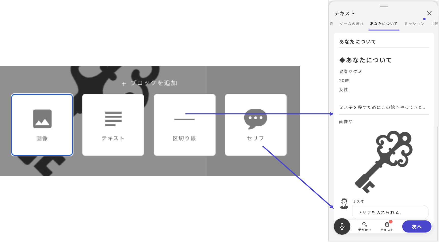 In the text tab, you can include not only text and images but also dividers and speech bubbles.