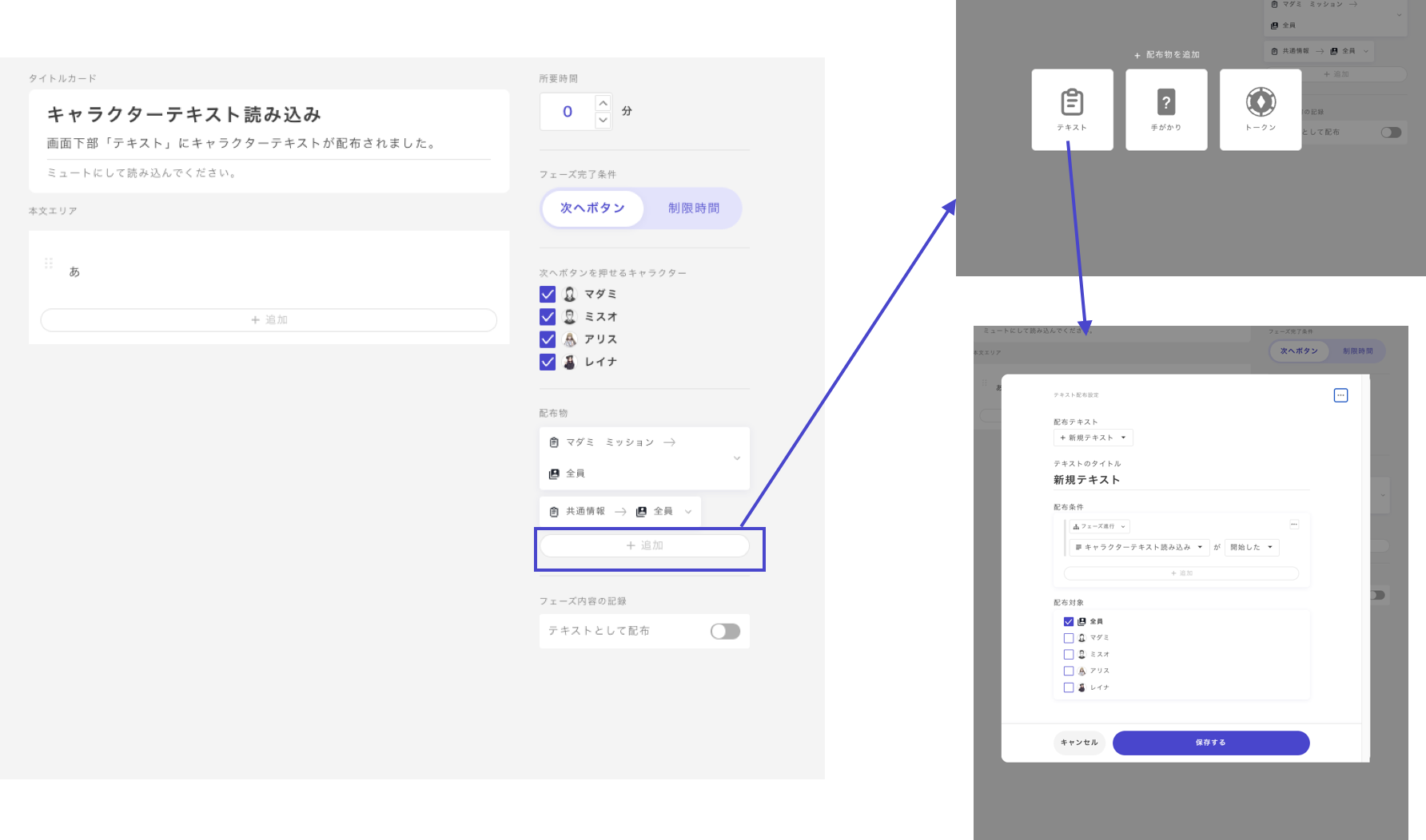 Apart from basic conditions like distributing to "a specific character" when "reaching a specific phase," you can set **complex distribution conditions**. Utilize these for distributing **special information** or **additional information**.
