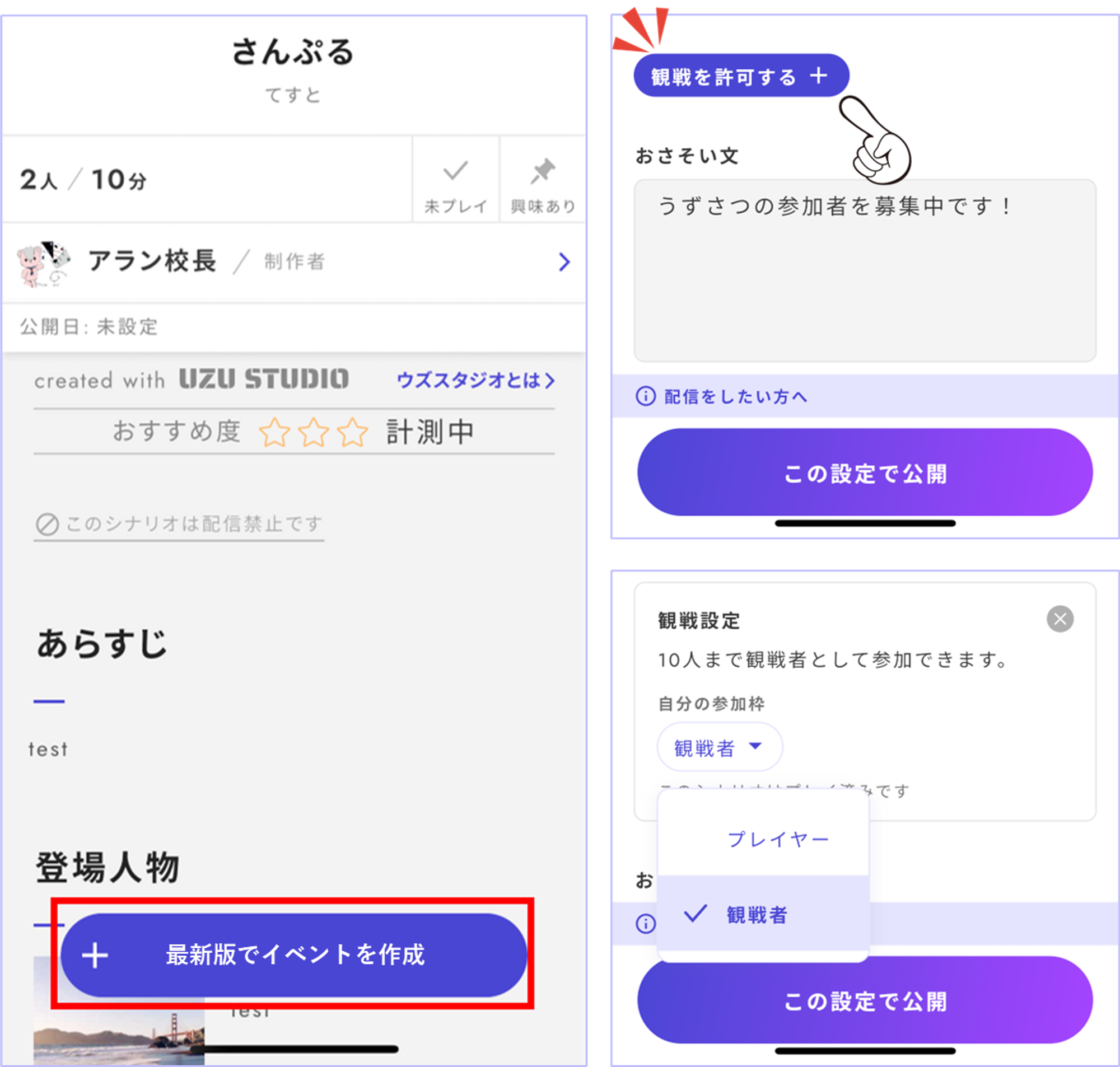 Since this event link takes users directly to the scenario's details page, which does not appear in the Uz app's search (as it hasn't been officially released), be careful when sharing the link in public forums like Twitter. Leaving the link publicly available can allow anyone to create an event and play the scenario before it is officially released.