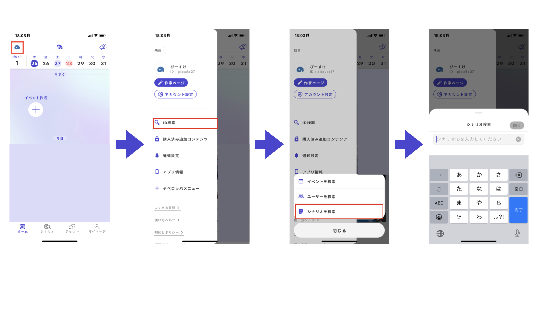 Tap the icon in the top left and select "ID Search" → "Search Scenario" from the menu bar.