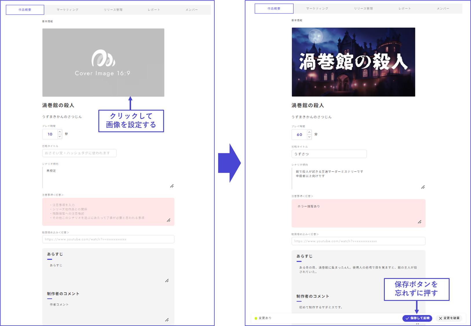 | Creator's Comment    | Include comments or credits if any.                                                                                                                                     | <p>This is my first time creating a murder mystery.<br>・Illustrations: \[Name]<br>・BGM: \[Name]</p>                                     |