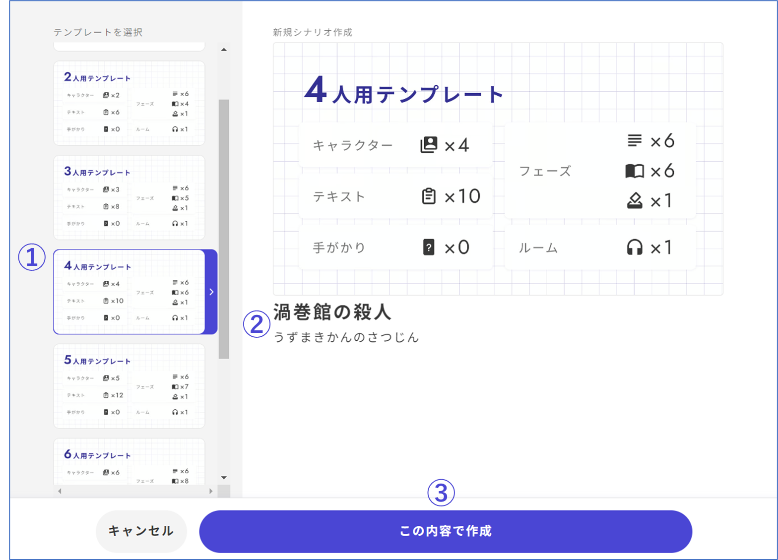 | Furigana             | Displayed under the title in the app’s scenario details screen. Only **hiragana** can be entered.                                                                       | うずまきかんのさつじん                                                                                                                             |