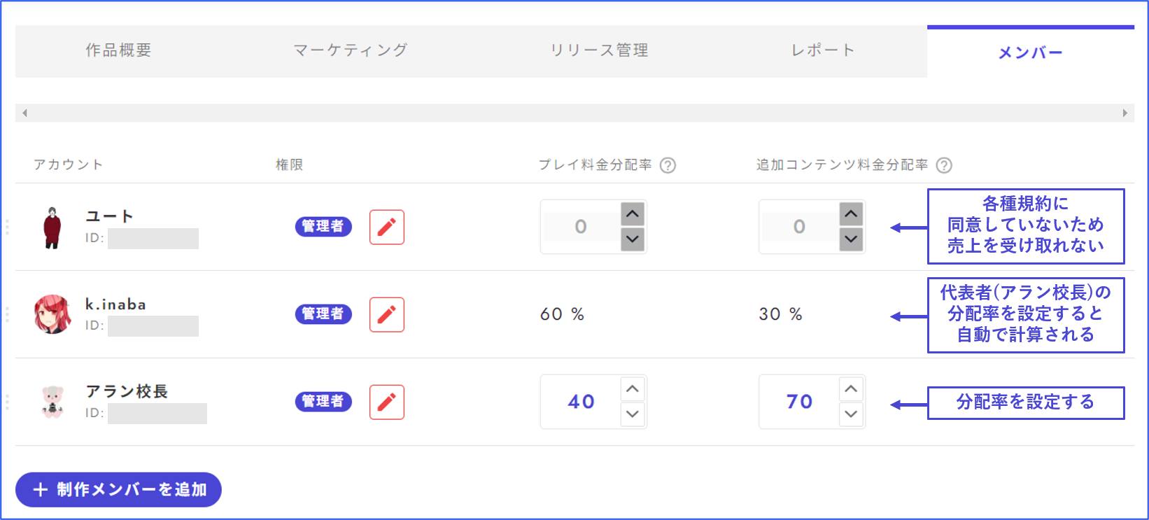 メンバー管理画面では、共同制作者・閲覧者の追加や売り上げの分配率の設定ができます。