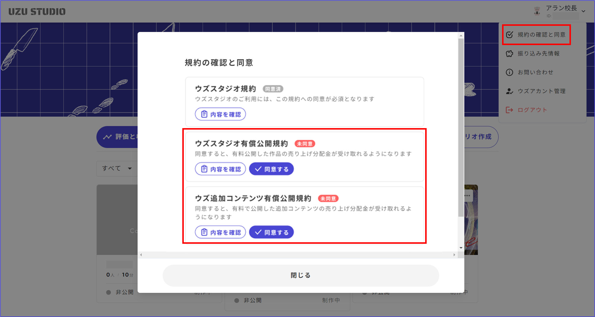 規約への同意は制作シナリオ一覧画面の右上のアイコンから行ってください。売り上げを受け取る人全員が規約に同意している必要があります。