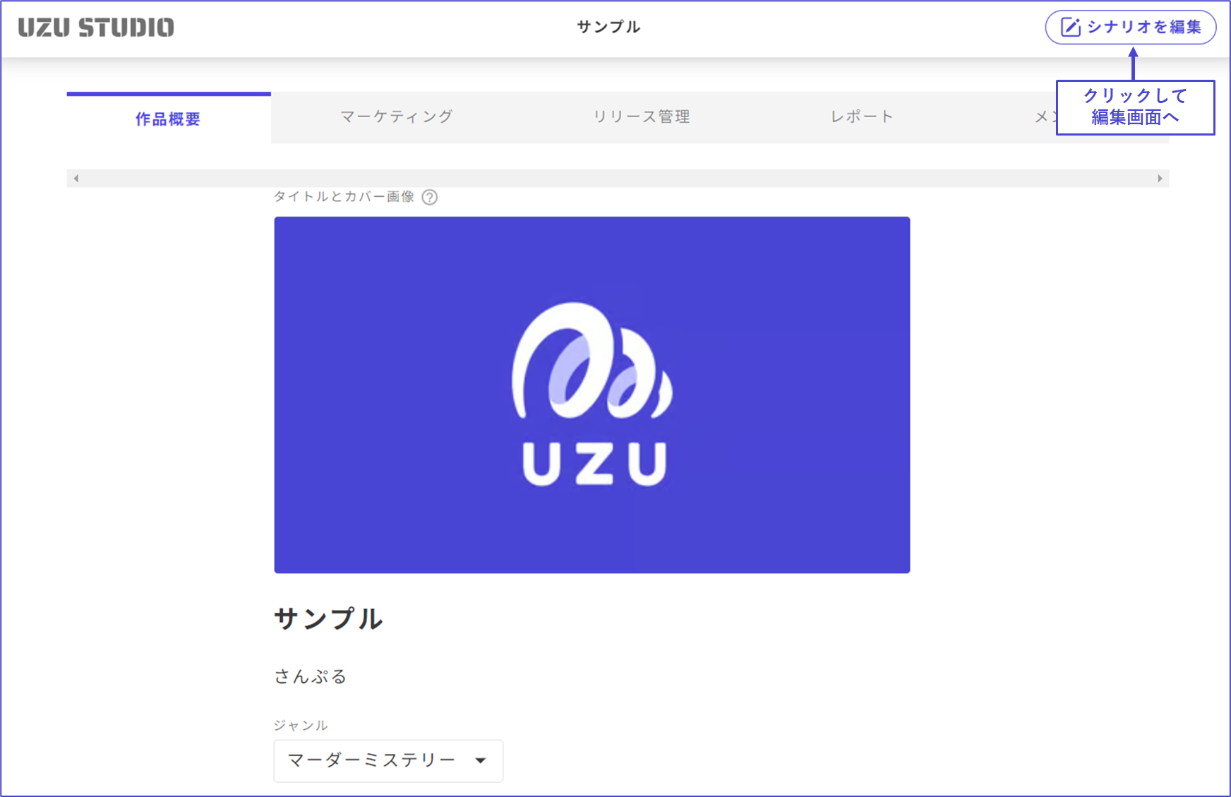 <table><thead><tr><th width="163.33333333333331">項目</th><th width="323">内容</th><th>ウズアプリで表示される場所</th></tr></thead><tbody><tr><td><a href="overview">作品概要</a></td><td>プレイ時間・シナリオ傾向・注意事項・あらすじ・作者コメント・ハッシュタグ・配信条件を設定する画面です。</td><td>シナリオ詳細画面</td></tr><tr><td><a href="marketing">マーケティング</a></td><td>追加コンテンツの作成・管理をする画面です。</td><td>－</td></tr><tr><td><a href="release">リリース管理</a></td><td>作品の制作ステータス・バージョンなどが見られる画面です。<br>テストプレイ時のイベント作成に必要なシナリオIDをコピーできる場所でもあります。</td><td>－</td></tr><tr><td><a href="report">レポート</a></td><td>「大好き数」や「プレイ人数」が表示される画面です。</td><td>－</td></tr><tr><td><a href="author">メンバー</a>　</td><td>共同制作者や閲覧権限を管理できる画面です。</td><td>シナリオ詳細画面のタイトルの下</td></tr></tbody></table>