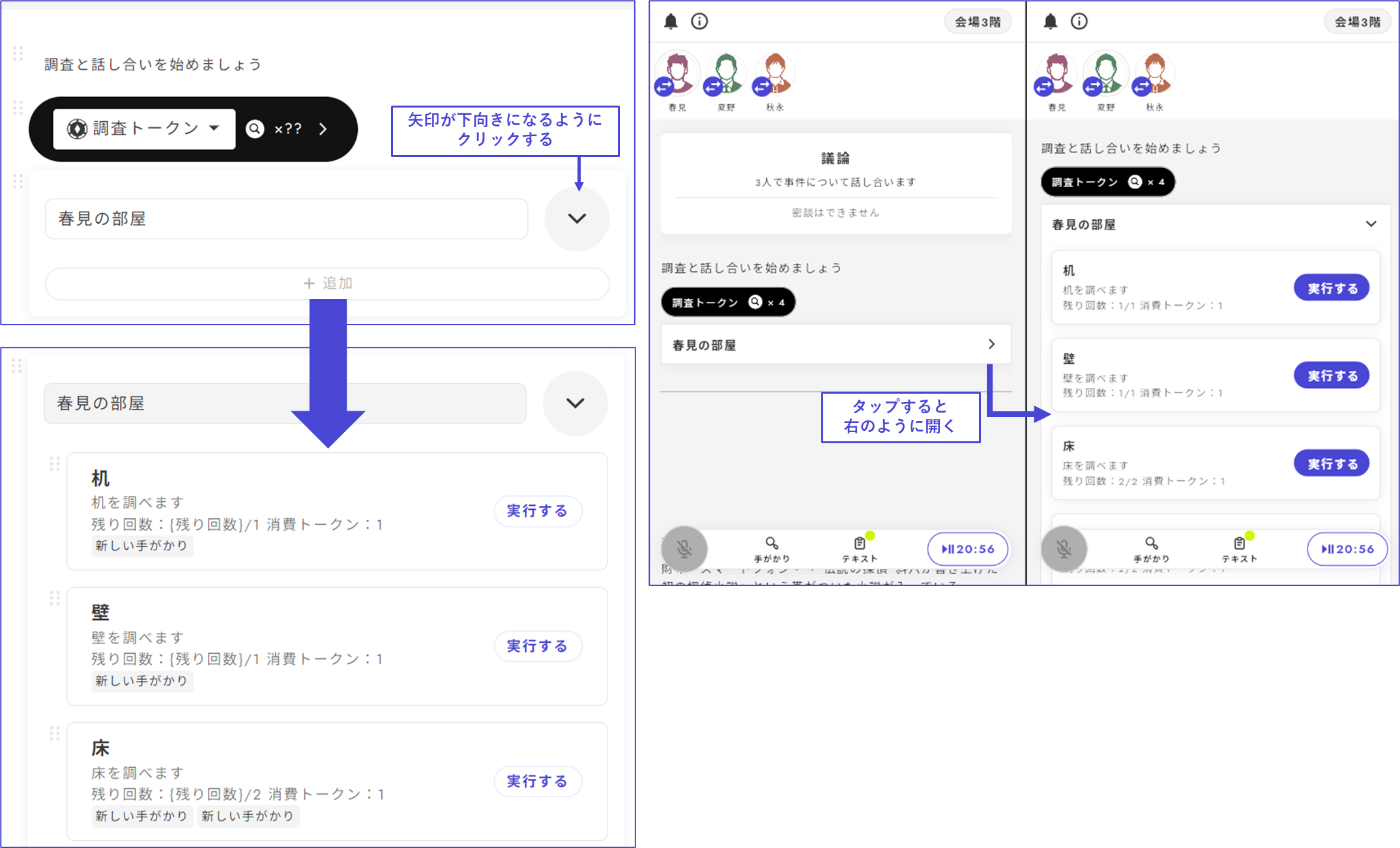 以下圖片顯示了添加牌庫的情況。當想要整理多個調查點，或進行類別分類時非常方便。在實際的遊戲畫面中，點擊箭頭部分，區塊會如右側所示展開。