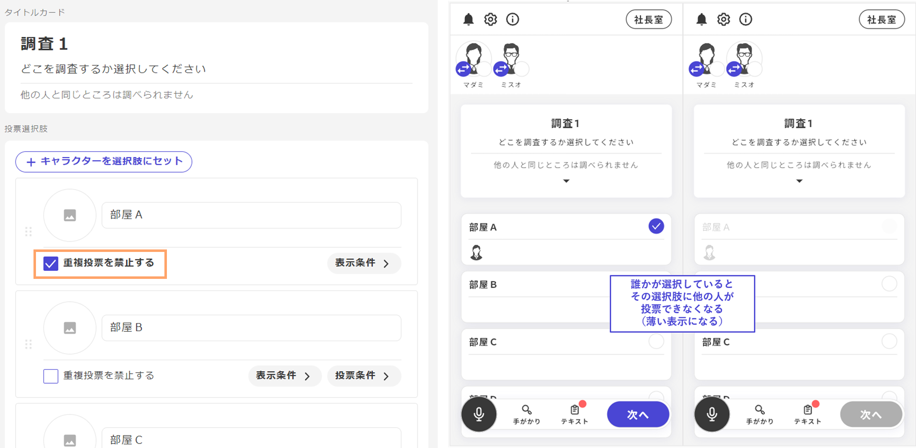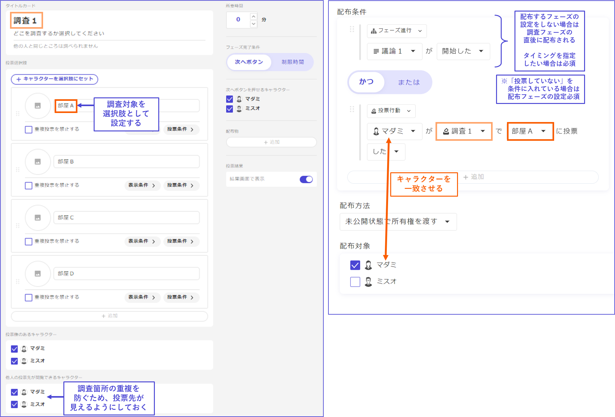 | 條件2      | 投票行動・○○在投票階段投票給△△ | 設置在①中創建的投票階段中，某角色投票給相應調查地點的條件。               |