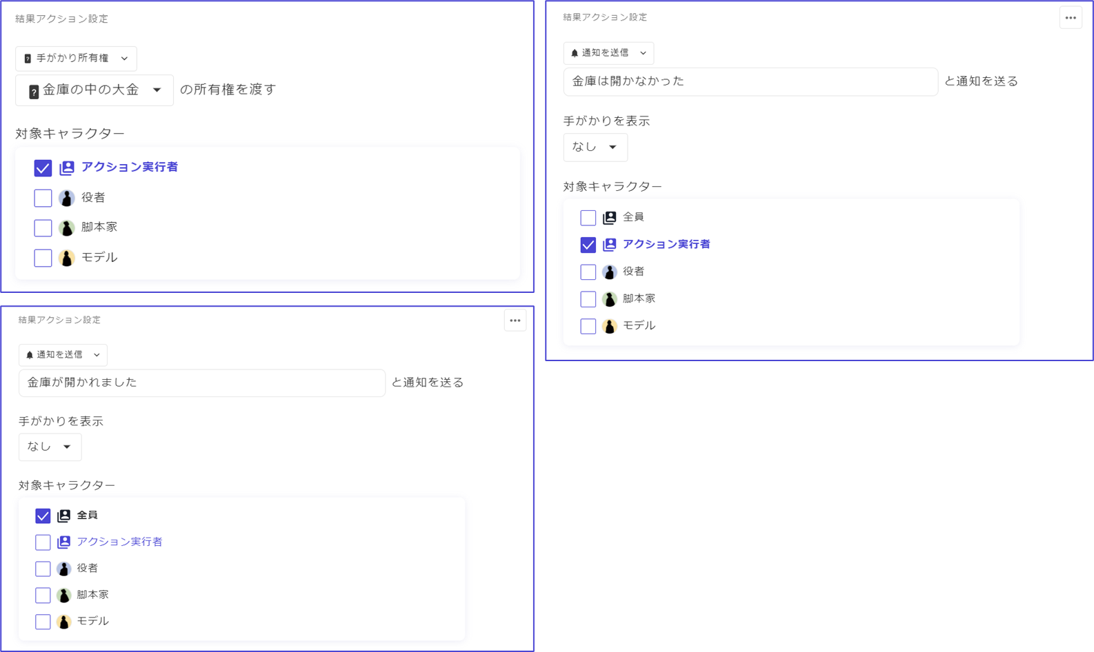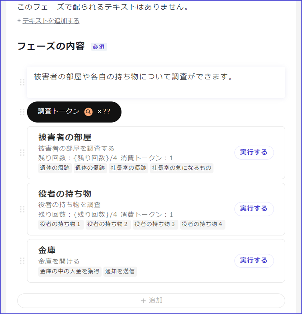 這些動作會在玩家按下「執行」按鈕一次時**作為一系列動作全部執行**。按照從上到下的順序處理，因此如果希望按「分配線索→發送通知」的順序處理，請在此畫面中從上到下排列。