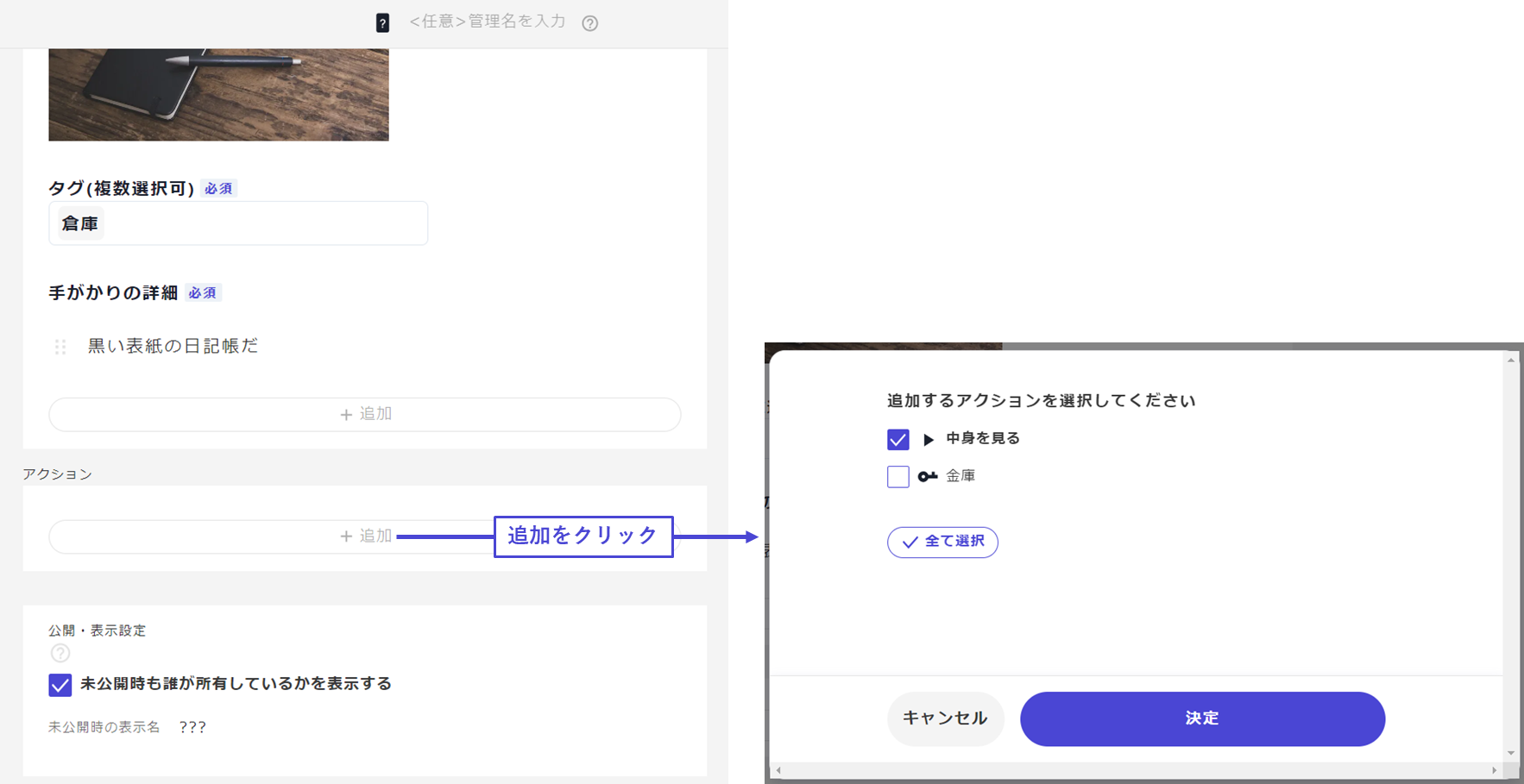以下示例中，想在「討論階段」中配置可以用密碼打開保險箱的動作。