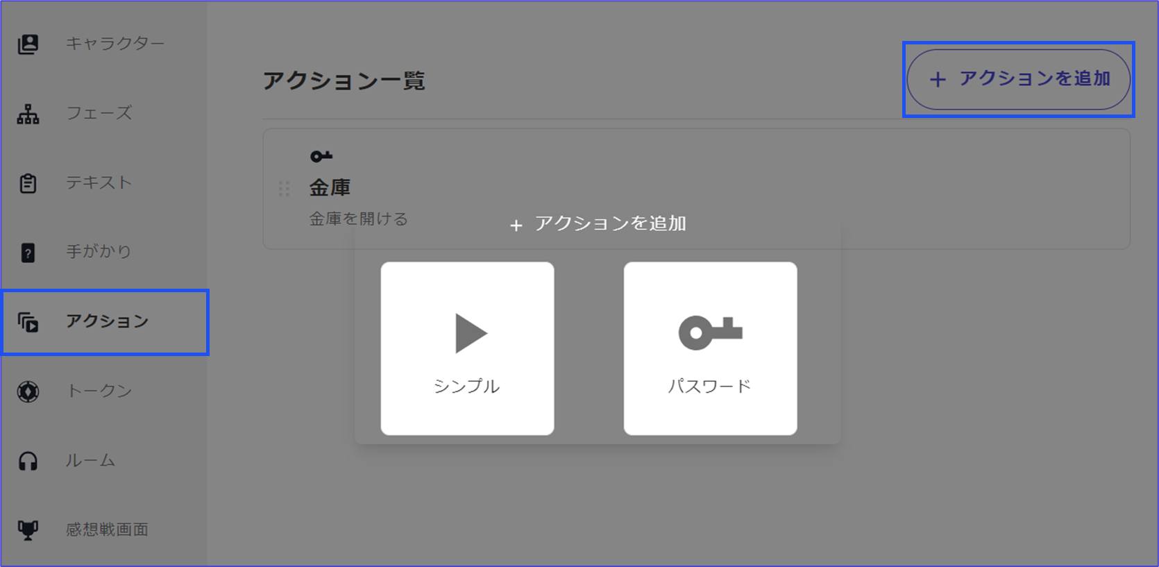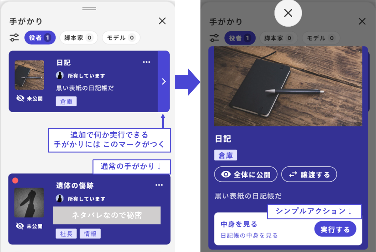 <table><thead><tr><th width="226">項目</th><th>內容</th></tr></thead><tbody><tr><td>發送通知</td><td>動作執行時在畫面上方以文字形式發送通知。</td></tr><tr><td>播放音效</td><td>動作執行時播放效果音。</td></tr><tr><td>公開線索</td><td>將特定的線索公開。所有權不會轉移。</td></tr><tr><td>階段轉換</td><td>強制轉移到特定的階段。<br>例如，在推理發表階段等一個玩家的判斷下可以轉移到下一階段的情況下使用是推薦的。</td></tr><tr><td>線索所有權</td><td>將特定的線索分配給角色。</td></tr><tr><td>線索查看權</td><td>將特定的線索查看權賦予角色。</td></tr><tr><td>移動通話房間</td><td>強制移動到特定的通話房間。</td></tr></tbody></table>