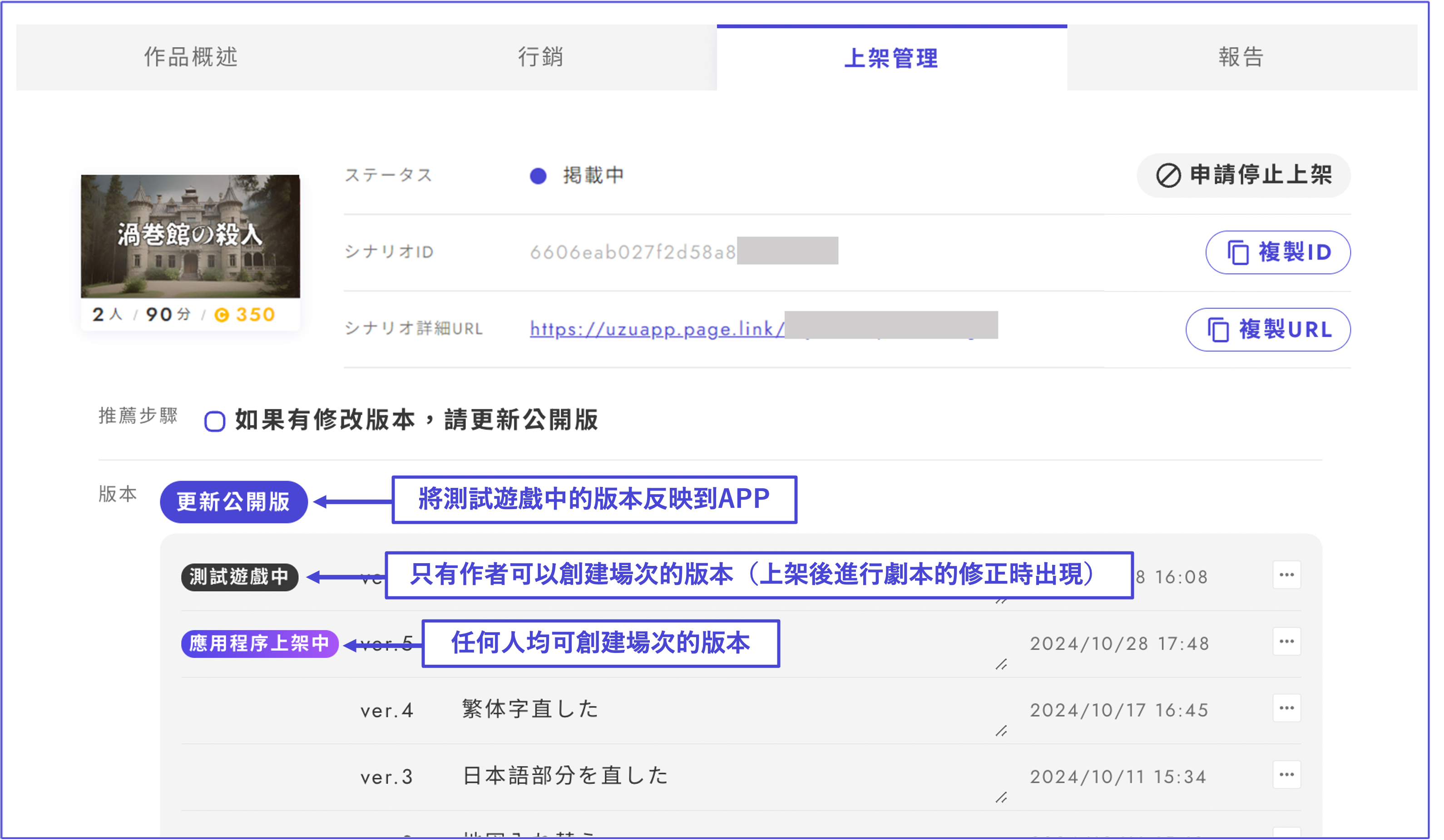 <table><thead><tr><th width="180.33333333333331">名稱</th><th>內容</th></tr></thead><tbody><tr><td>應用程序上架中</td><td>在應用程式上按下「用此劇本遊玩」即可遊玩的版本<br>按下更新按鈕後會反映</td></tr><tr><td>測試遊戲中</td><td>僅能在與UZU STUDIO作家帳戶綁定的UZU帳戶中創建事件的版本<br>當此版本存在時，僅作者帳戶中會在UZU應用程式內的劇本詳細畫面中顯示兩個場次創建按鈕</td></tr></tbody></table>