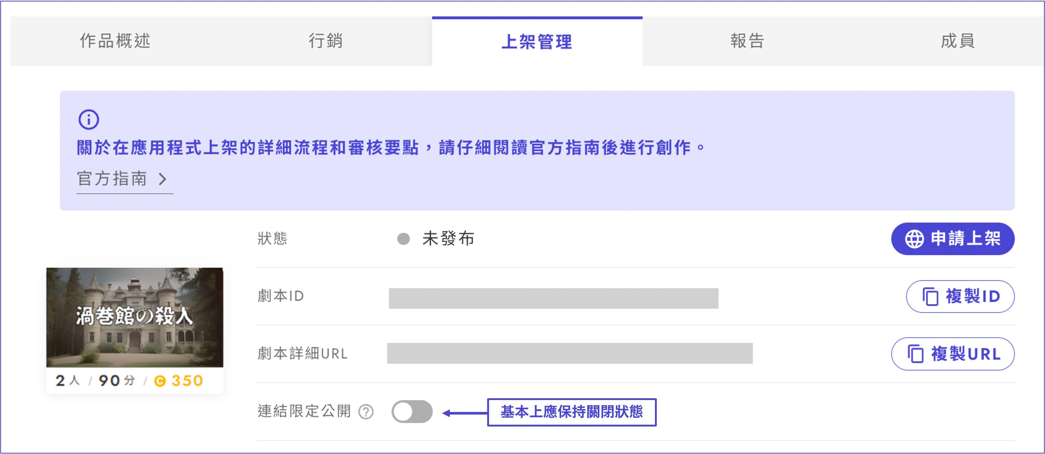 換句話說，當連結限定公開開啟時，一旦URL洩露，無關劇本是否正在修正或測試遊玩中，任何人都可以遊玩該劇本，因此除非有特殊原因，基本上應保持關閉狀態。