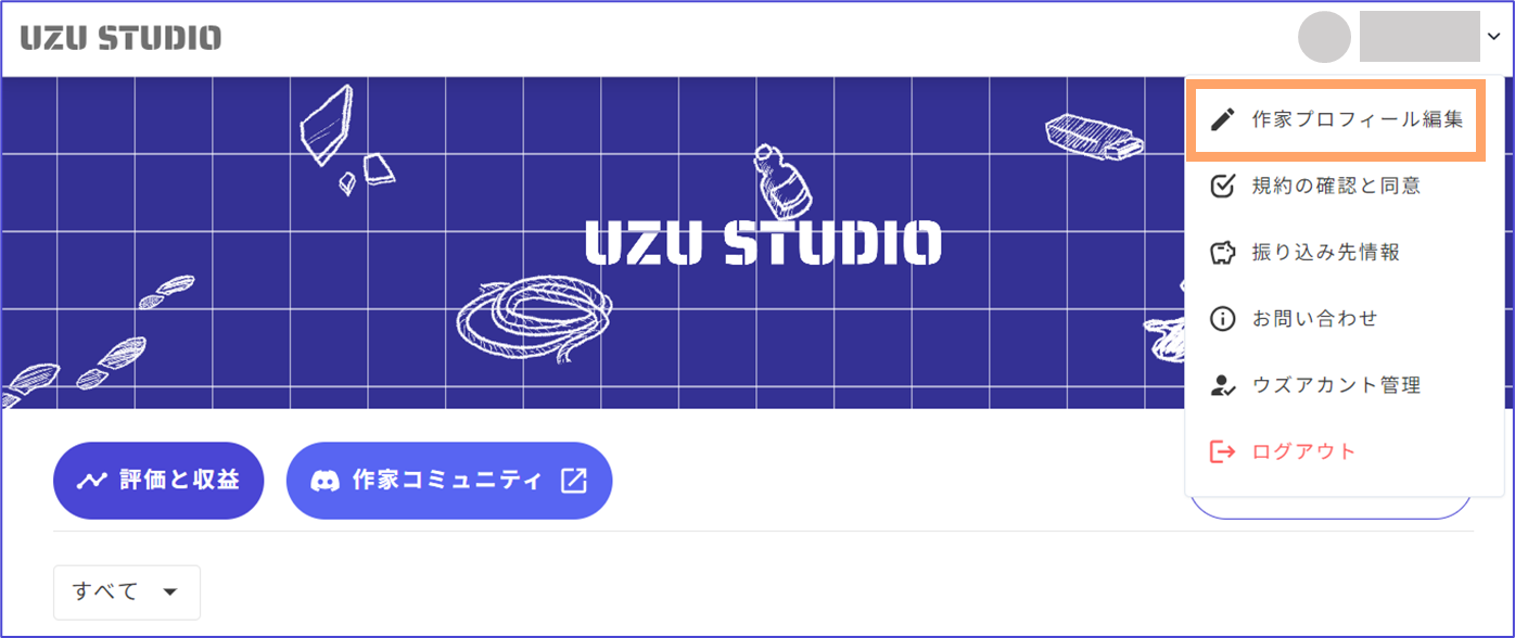 在UZU STUDIO的主畫面，即製作劇本一覽畫面中，可以變更作家個人資料。